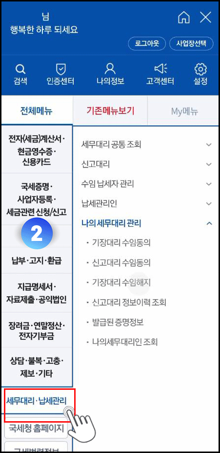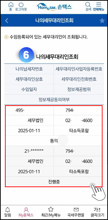 5. 세무대리납세관리 메뉴 클릭 - 나의 세무대리 관리 메뉴 클릭 - 나의세무대리인 조회 메뉴 클릭