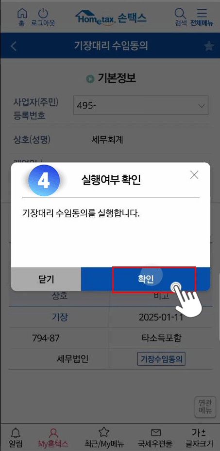 03. 주민등록번호(또는 사업자등록번호) 선택 - 기장수임동의 버튼 클릭