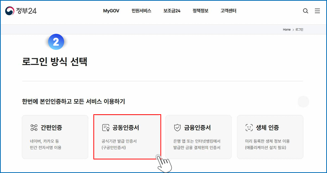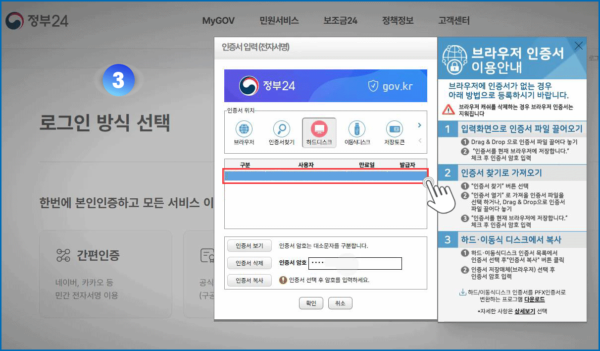03. 공동인증서 선택 - 비밀번호 입력 - 확인 버튼 클릭