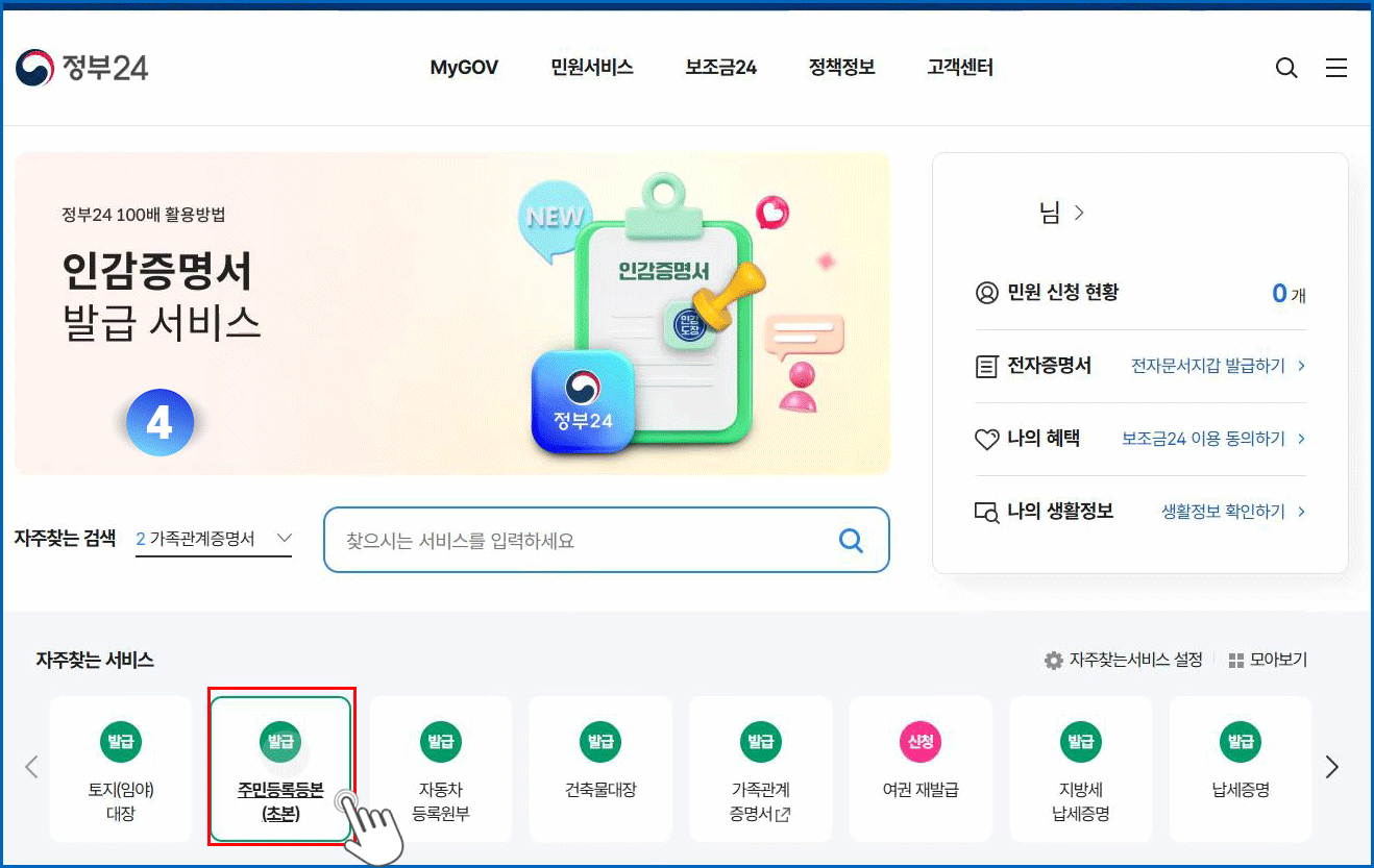 04. 주민등록등본(초본) 메뉴 클릭