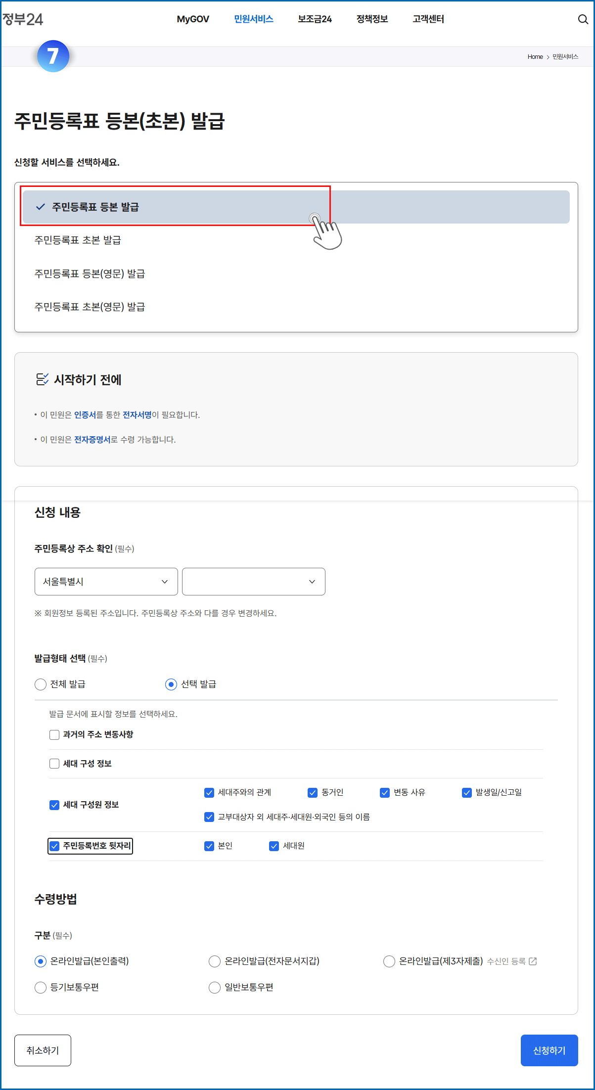 06. 주민등록표 등본 발급 메뉴 클릭 - 주소 선택 - 선택발급 체크 - 세대 구성원 정보 및 주민등록번호 뒷자리 체크