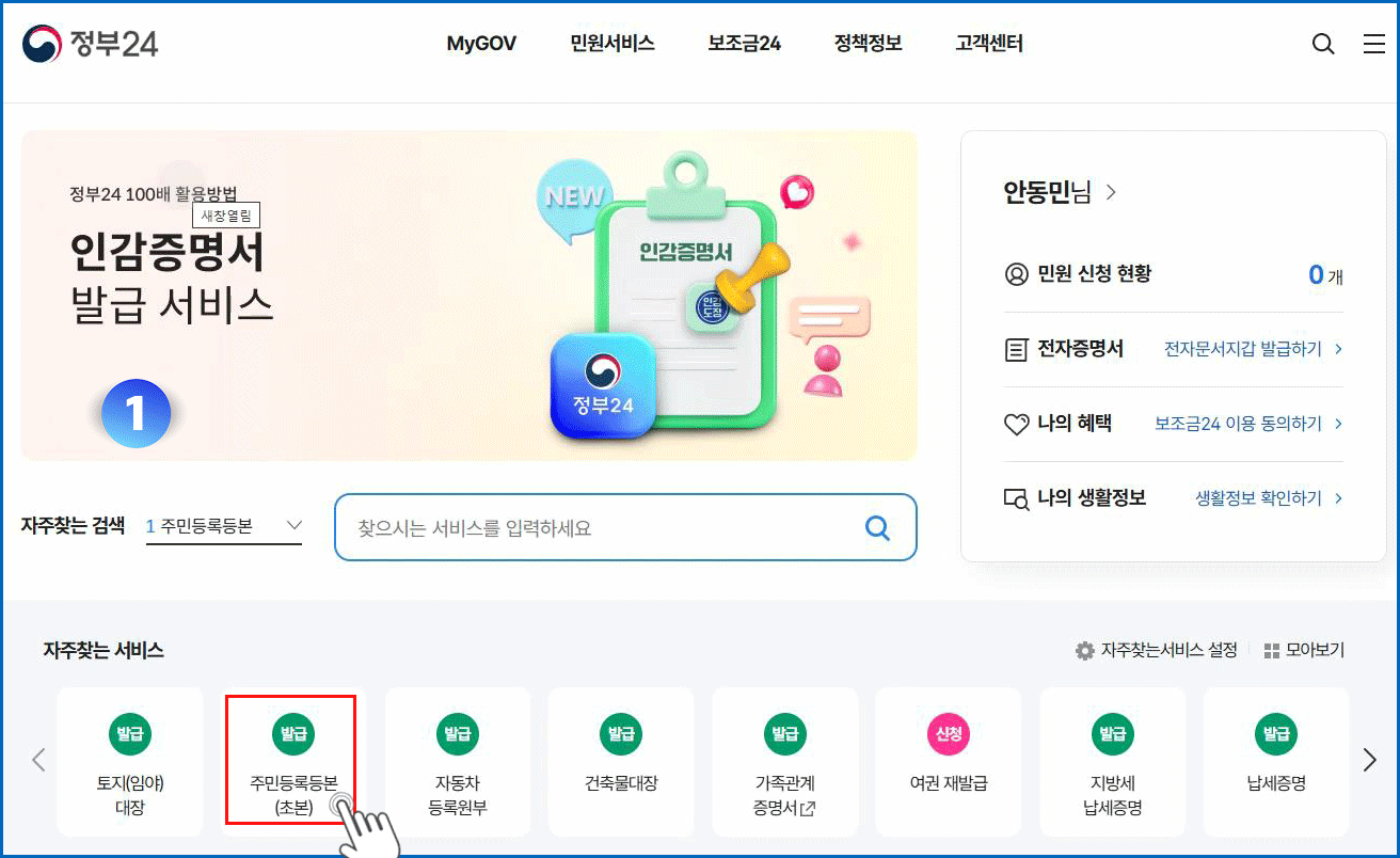 01. 주민등록등본(초본) 메뉴 클릭