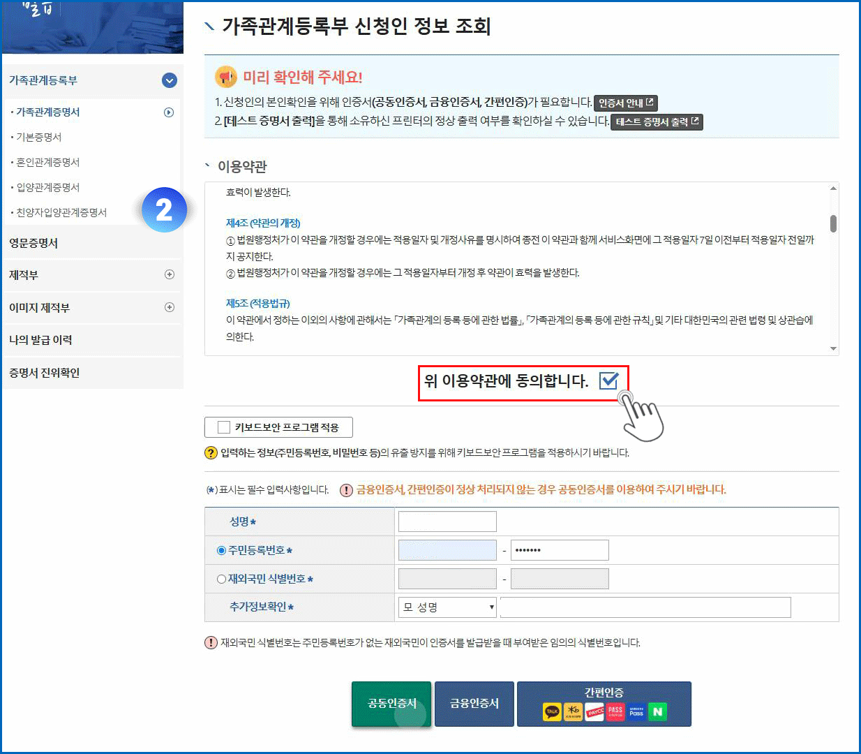 02. 이용약관 체크 - 이름 주민번호 추가정보확인 입력 - 공동인증서 메뉴 클릭