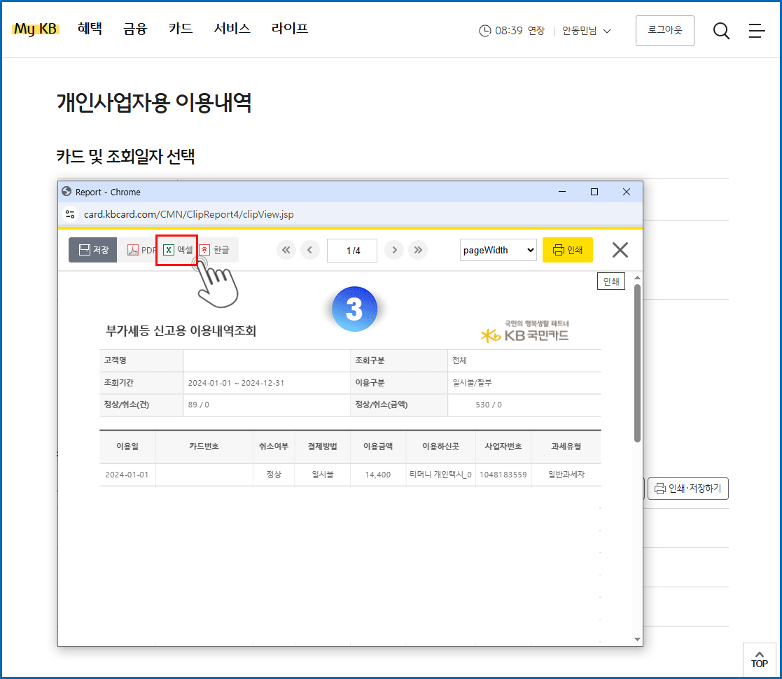 02. 조회기간 2024년 1년 설정 - 조회 버튼 클릭 - 안쇄저장하기 버튼 클릭