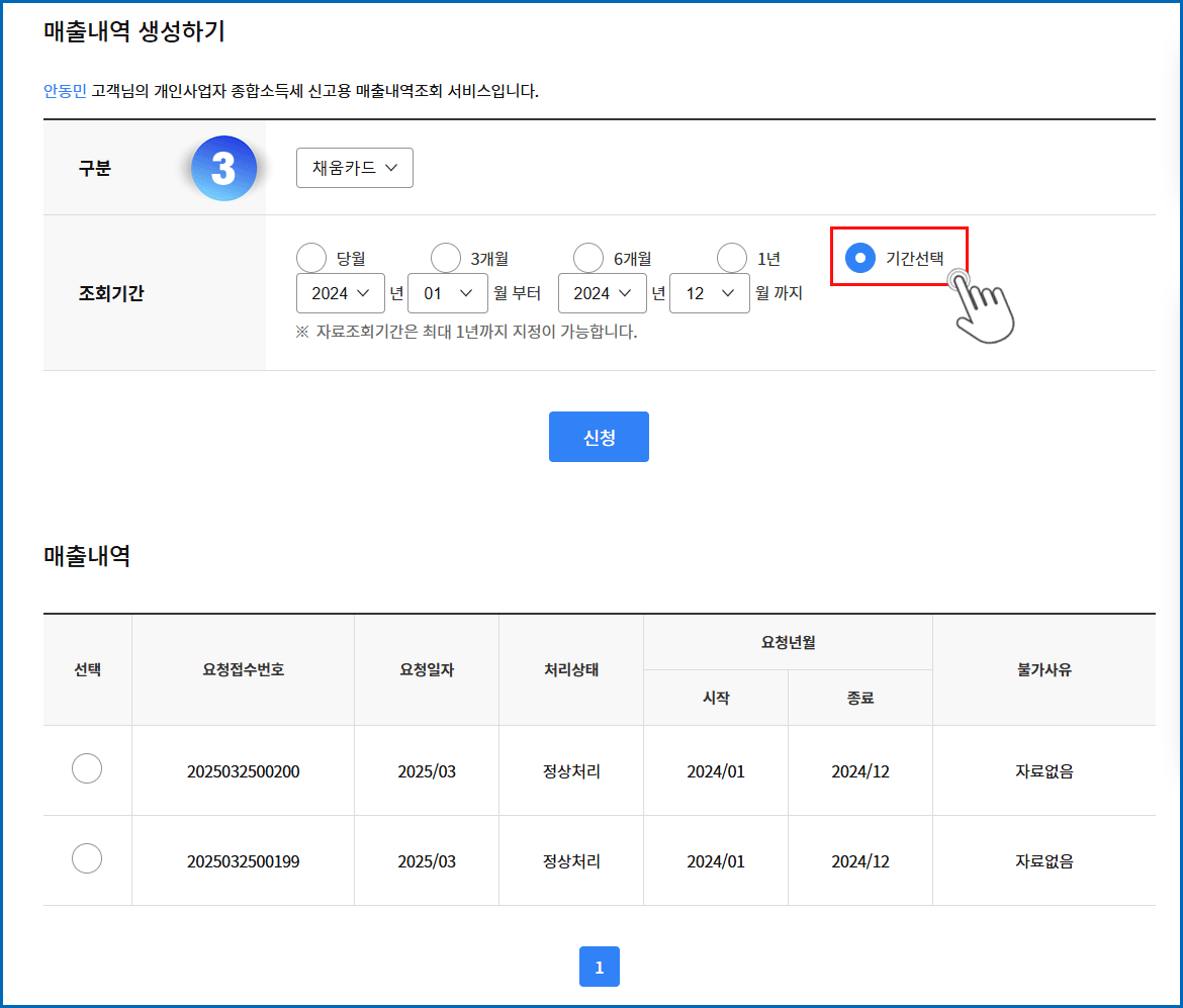 03. 기간선택 라디오 버튼 체크 - 기간 선택 - 신청 버튼 클릭