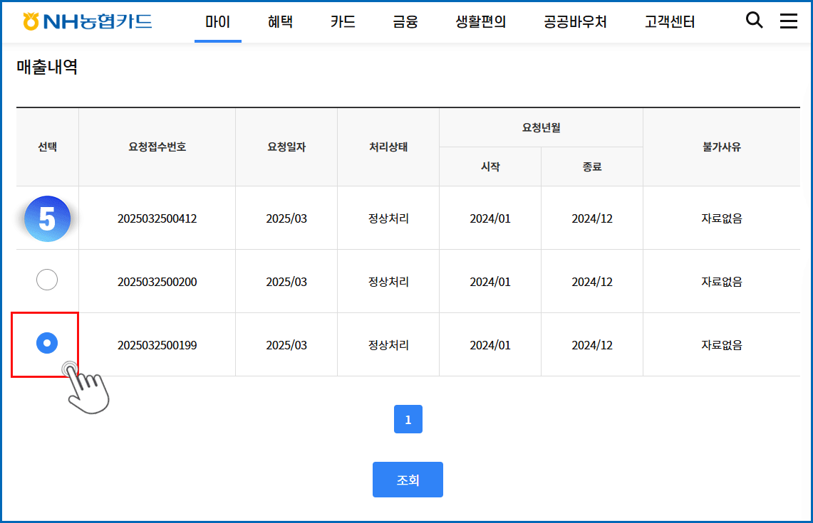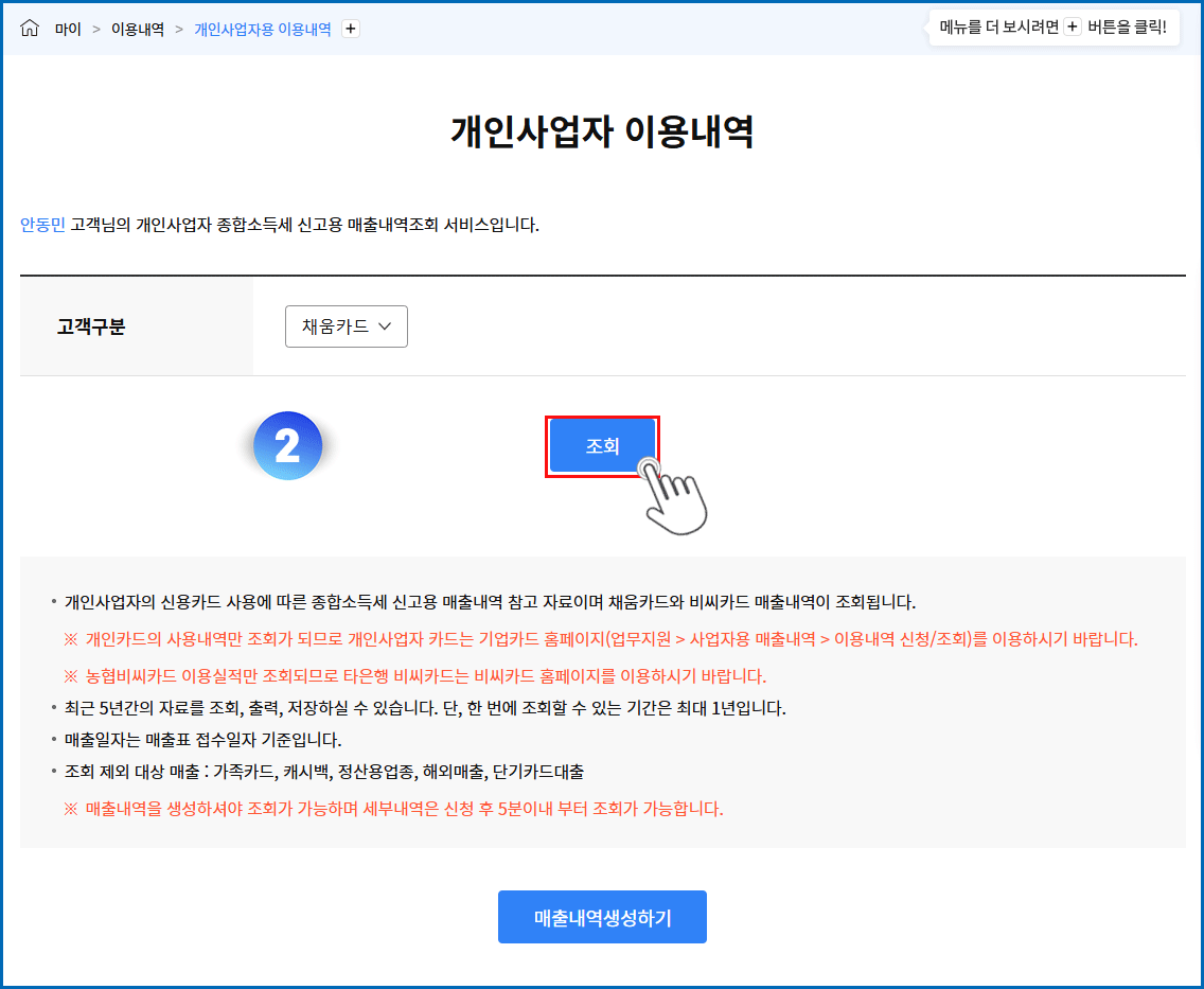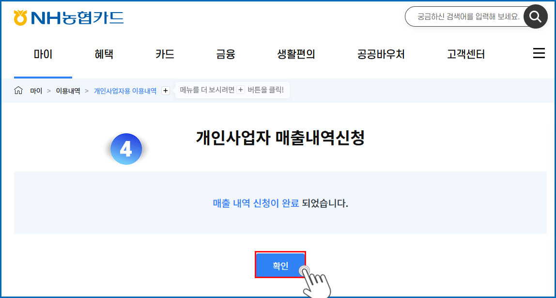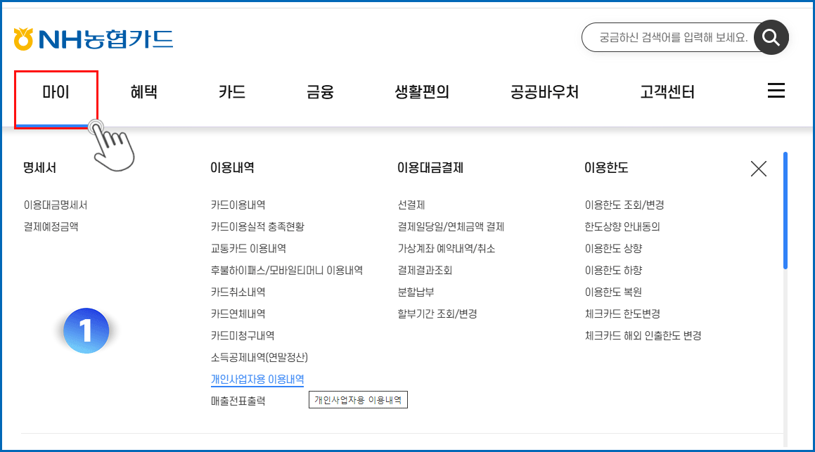 01. 마이 메뉴 클릭 - 개인사업자용 이용내역 메뉴 클릭