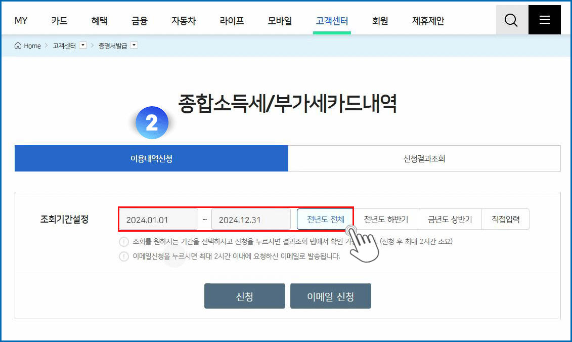02. 기간 전년도 전체 선택 ( 2024년 1월 1일 ~ 12월 31일 ) - 신청 버튼 클릭