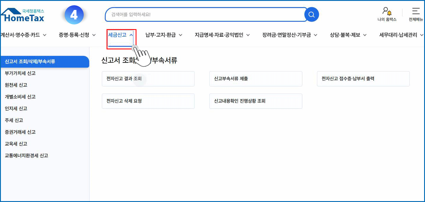 04. 세금신고 메뉴 클릭 - 신고서조회삭제부속서류 메뉴 클릭 - 전자신고 결과 조회 메뉴 클릭