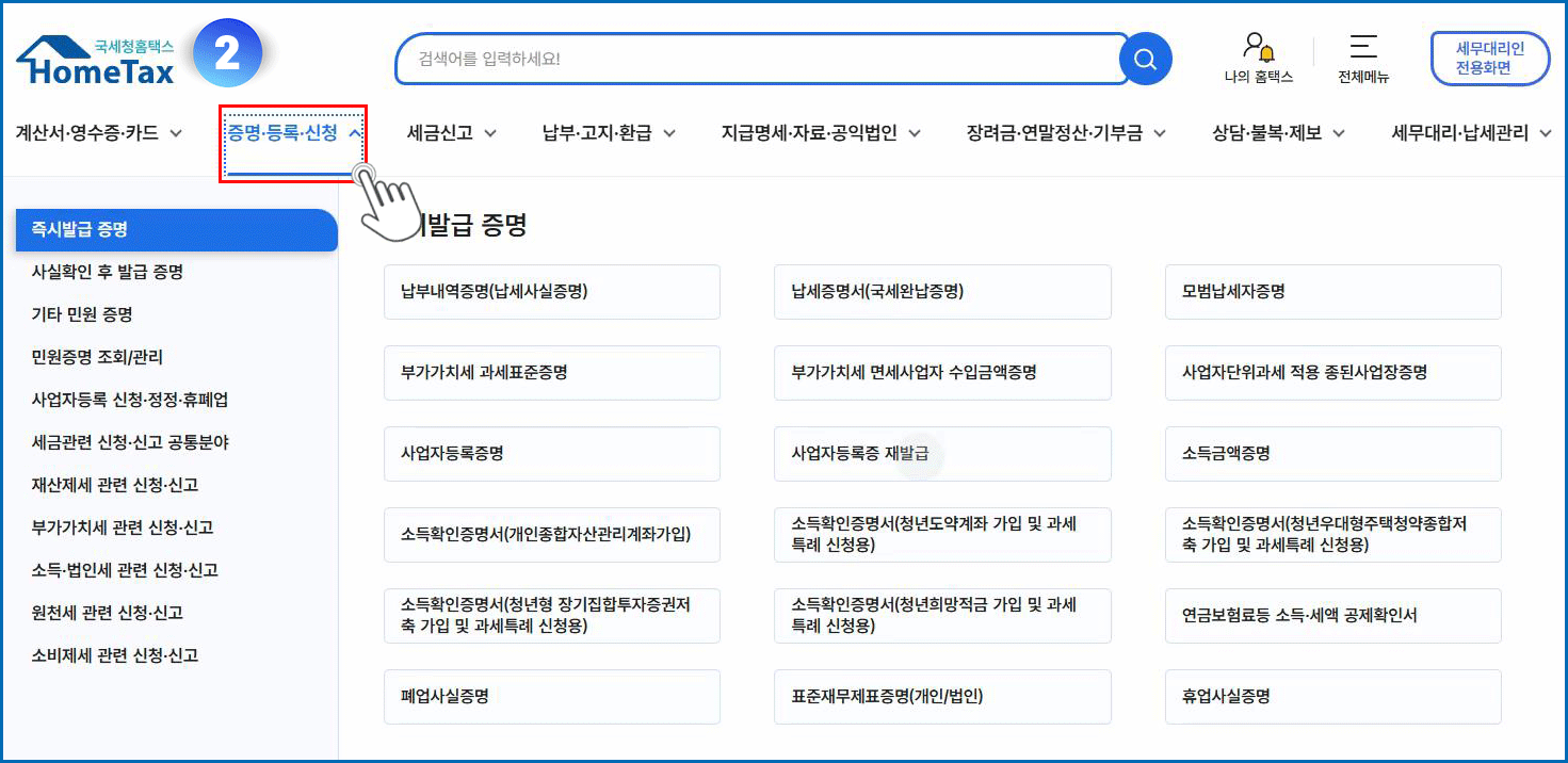 02. 증명등록신청 메뉴 클릭 - 즉시발급 증명 메뉴 클릭 - 사업자등록증 재발급 메뉴 클릭