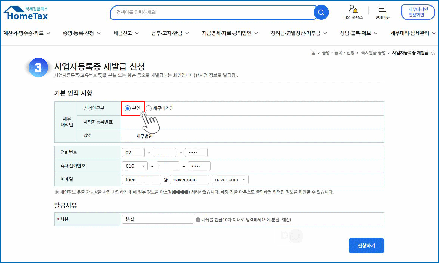 03. 신청인 구분 본인 체크 - 사유란 분실 입력 - 신청하기 버튼 클릭