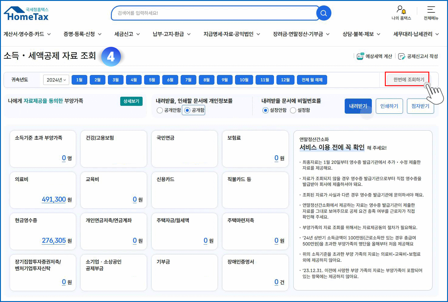 04. 귀속년도 2024년 선택 - 한번에 조회하기 메뉴 클릭 - 공개함 체크 - 내려받기 메뉴 클릭