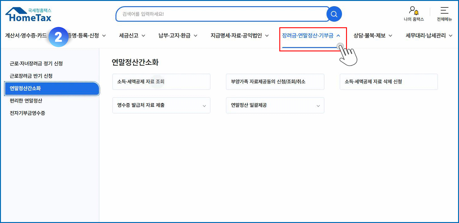 02. 장려금연말정산기부금 메뉴 클릭 - 연말정산간소화 메뉴 클릭 - 소득세액공제 자료 조회 메뉴 클릭