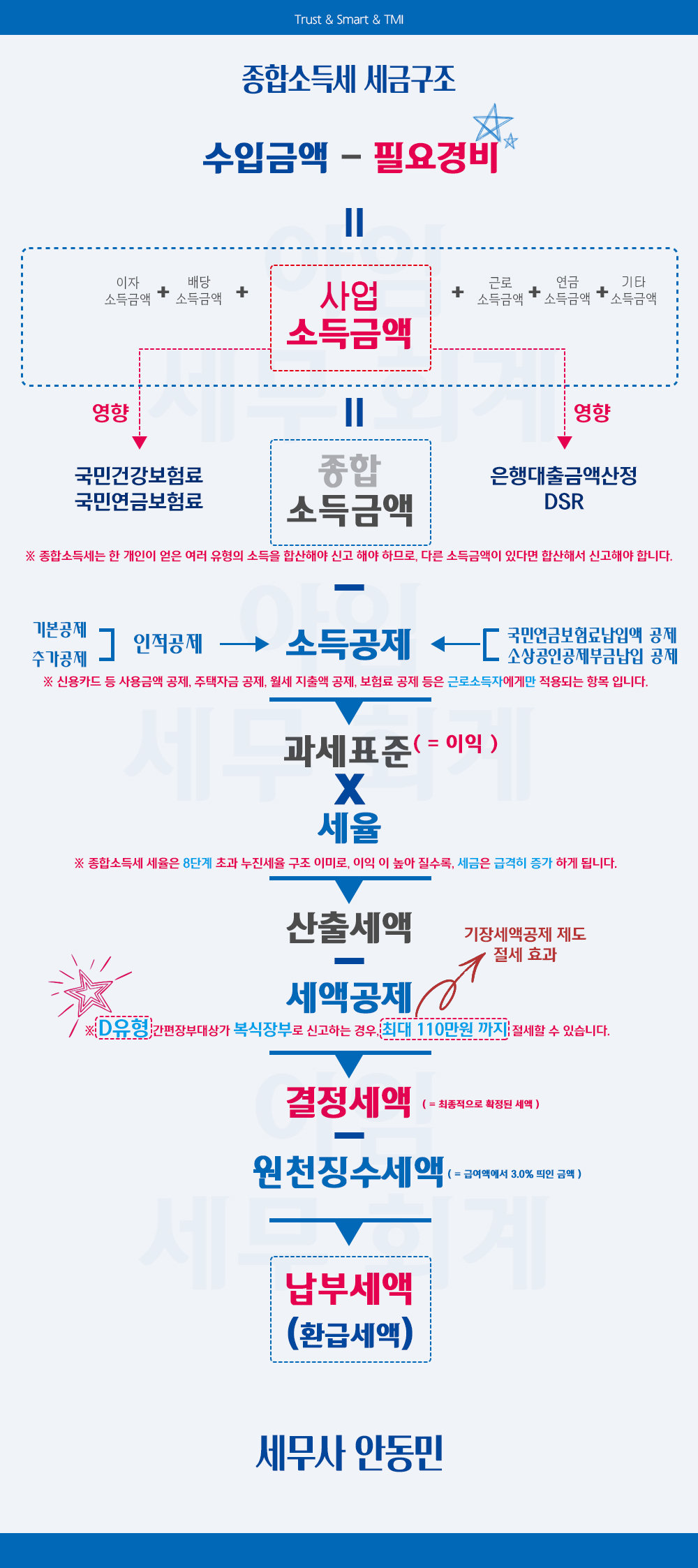 [(수입금액 - 필요경비) - 소득공제] X 세율 - 세액공제 - 세액감면 - 기납부세액