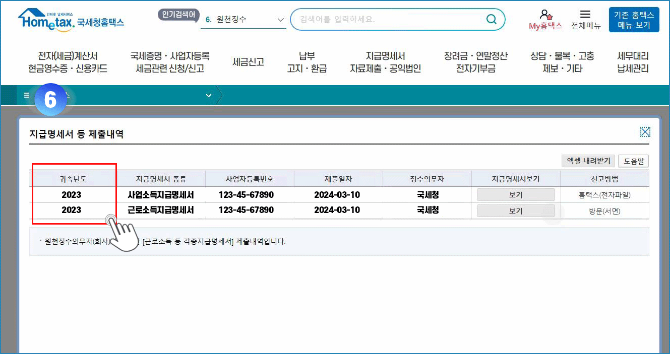 05. 연말정산지급명세서 탭 클릭 - 지급명세서 등 제출내역 메뉴 클릭