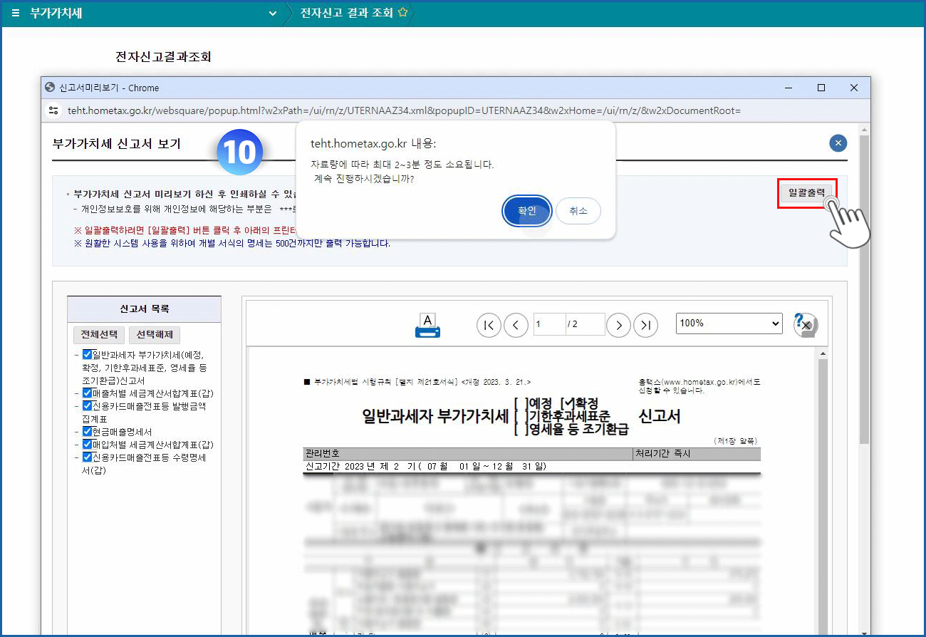 10. 일괄출력 버튼 클릭 - 확인 버튼 클릭