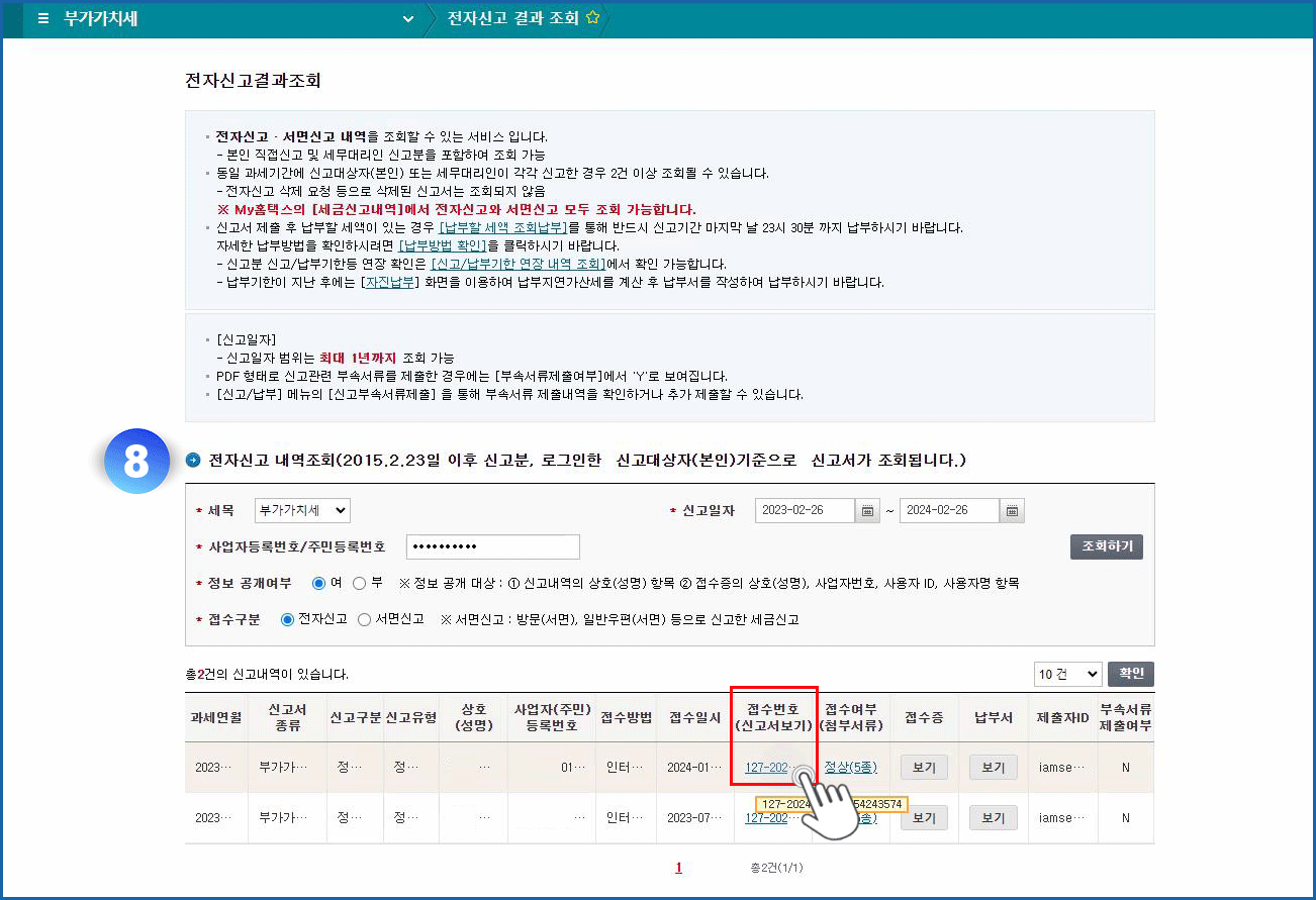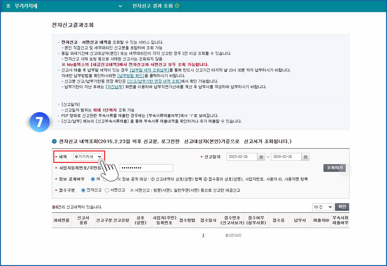 07. 세목 부가가치세 선택 - 신고일자 선택 - 사업자등록번호 입력 - 조회하기 버튼 클릭