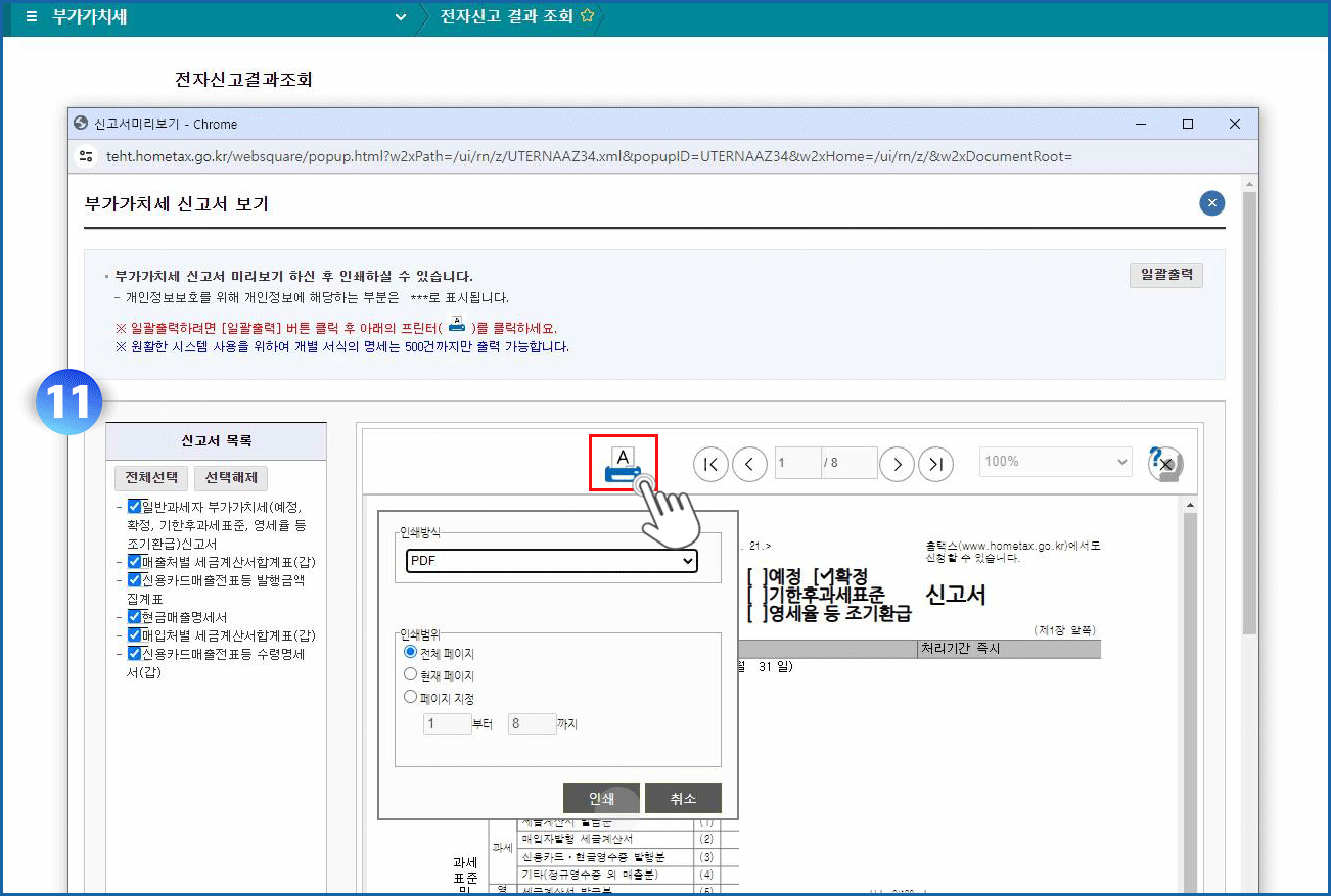 11. A아이콘 클릭 - 인쇄 버튼 클릭