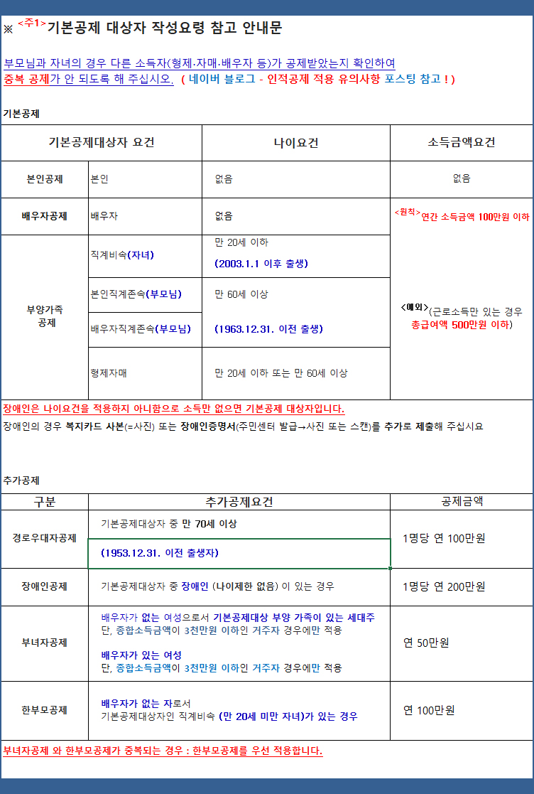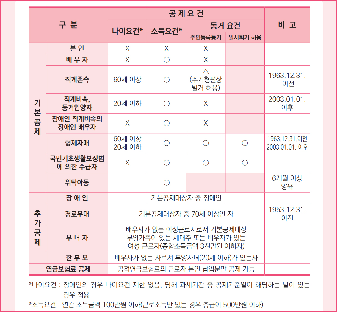 [ 국세청 책자 - 부양가족 인적공제 - 요건 ]