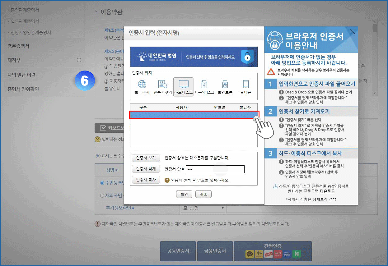 06. 인증서 선택 - 비밀번호 입력 - 확인 버튼 클릭