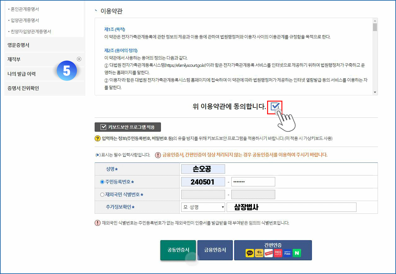 05. 이용약관 동의 체크 - 인적사항 입력 - 공동인증서 버튼 클릭